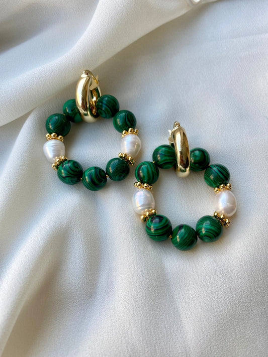 ESTHER brass hoop earrings with malachite beads and freshwater pearls