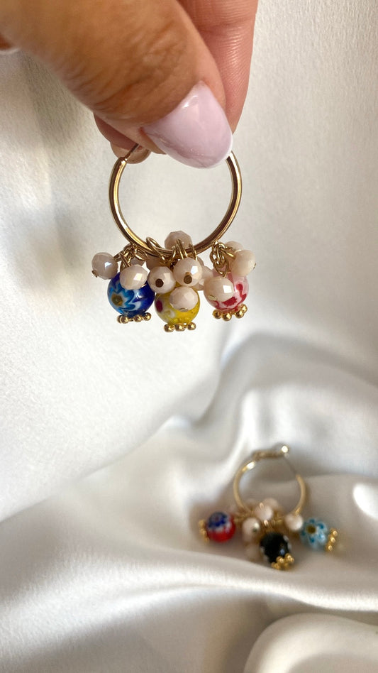 MILLEFIORI DANCE brass hoop earrings with millefiori glass beads and freshwater pearls