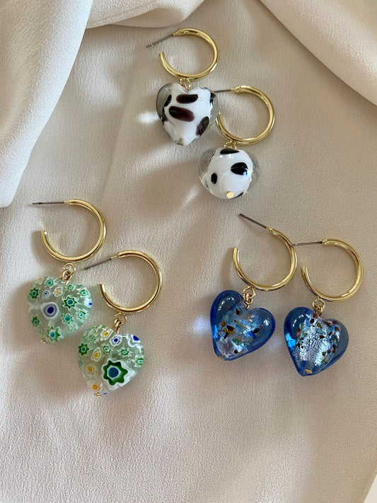 Murano heart earrings on gold hoops