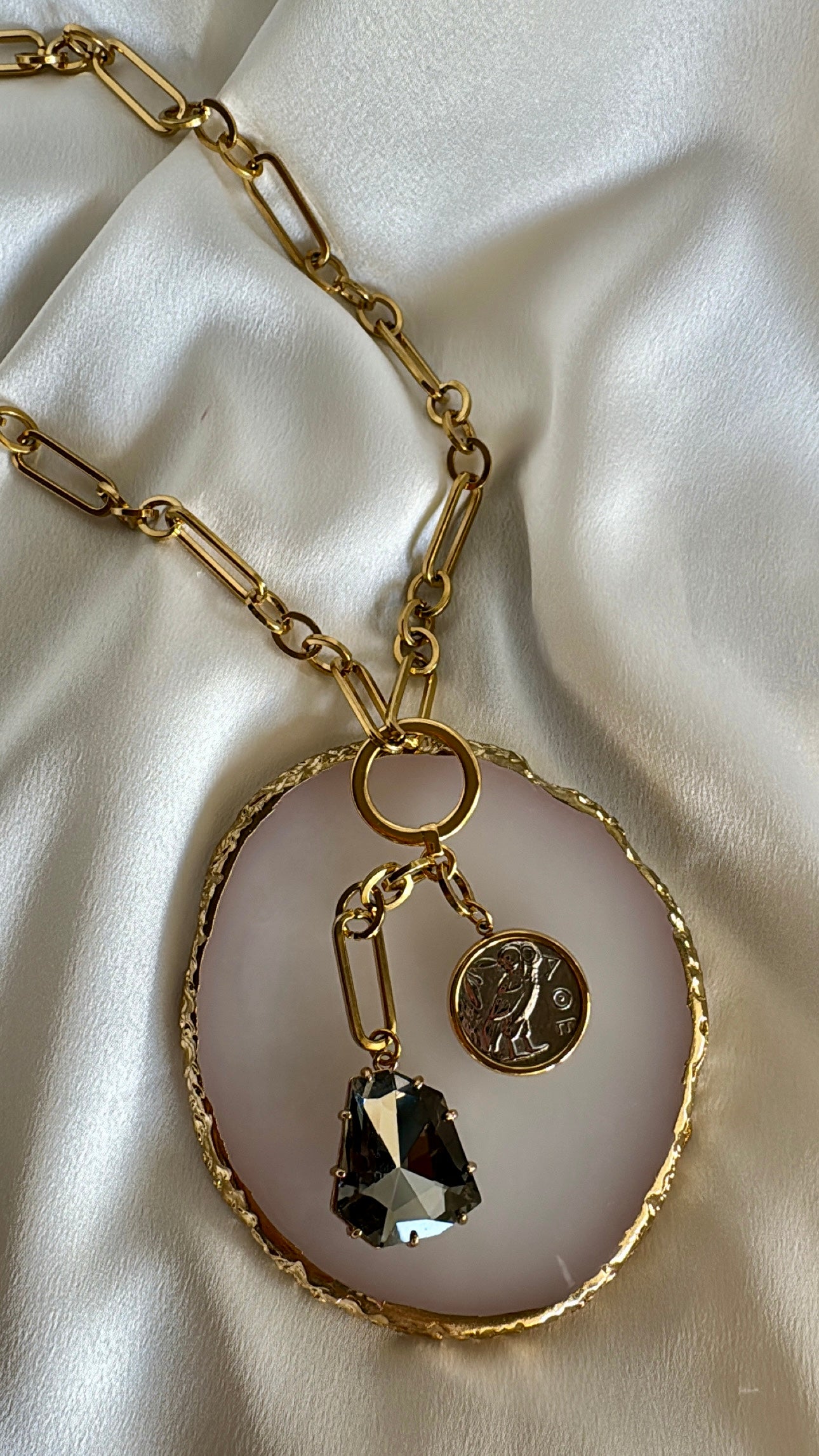Introducing our beautiful ATHENA necklace! This unique piece is crafted with 18K gold plated stainless steel chain, a chunky crystal charm and a stainless steel double faceted charm with Greek goddess Athena on the one side and Athena’s symbol, the owl on the other. The necklace effortlessly complements both summer and winter ensembles. It's an impressive gift suitable for any occasion.