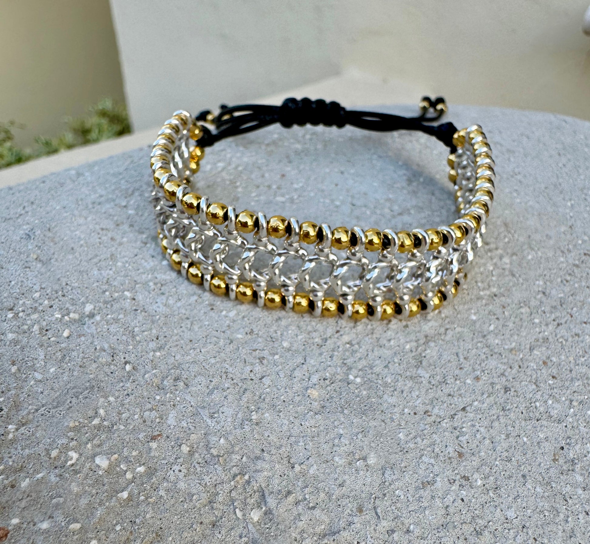 Introducing our BRAID bracelet a blend of elegance and bohemian charm! It is handwoven with gold and silver plated beads through black nylon cord and finished with a macramé closure for adjustable wear on every wrist.