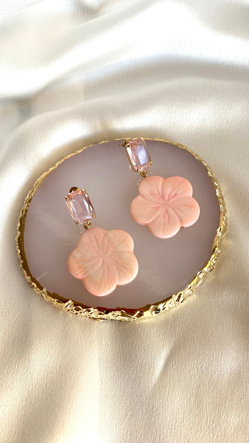 Introducing our CAPRICE earrings! Crafted with baby pink mother of pearl flowers hanging from light pink crystals, these earrings reflect elegance and freshness, making them the perfect accessory to elevate your summer outfit. They can also be a beautiful gift idea.