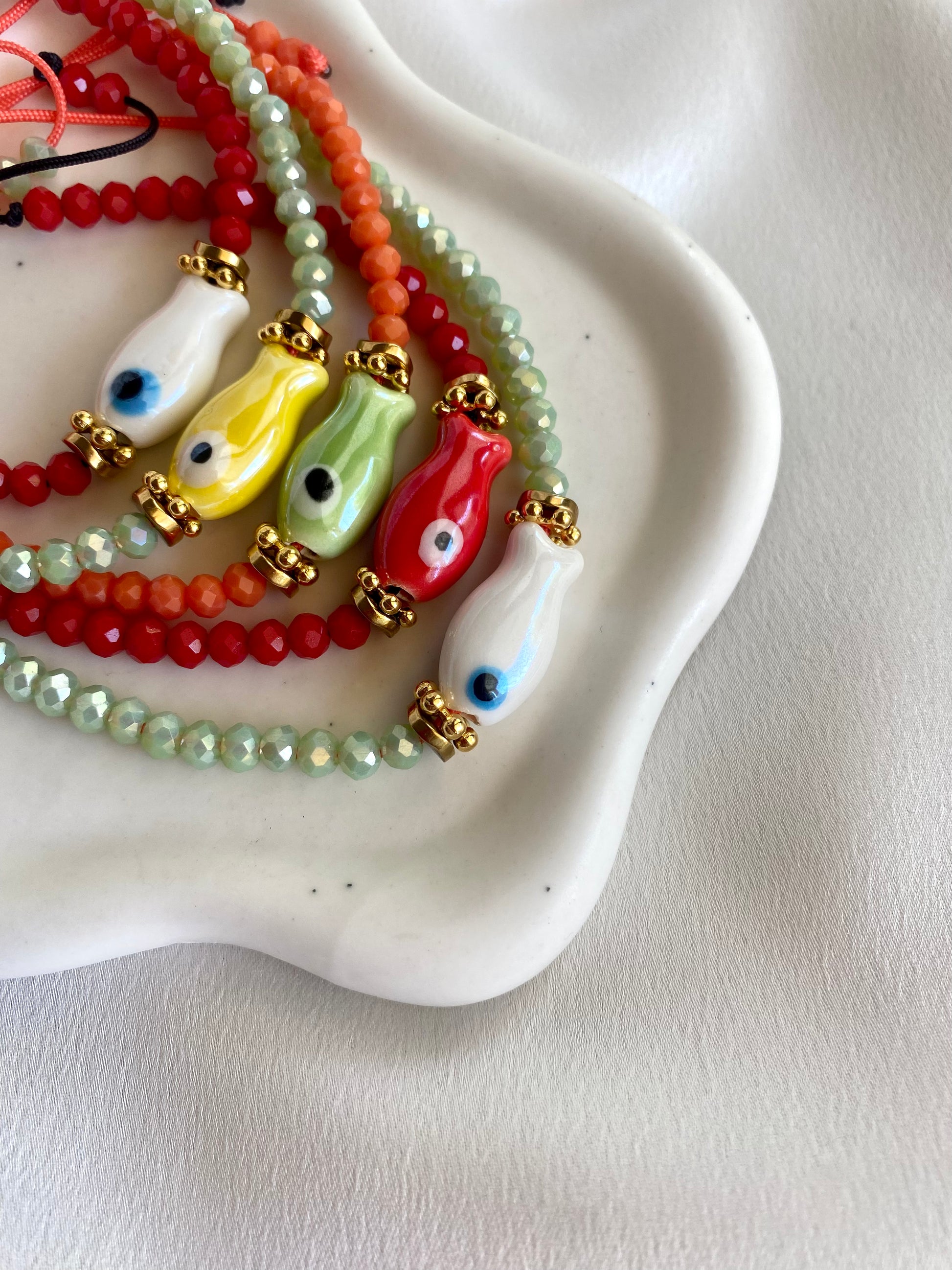 Introducing our vibrant KEA summer bracelets! Inspired by the Greek islands, they’re handcrafted with colorful crystal beads, irregular gold hematite beads, and a ceramic fish centerpiece. Available in a variety of summer hues, these bracelets are designed to brighten your mood with their cheerful colors. Featuring a macramé closure, they adjust to fit every wrist, and can even be worn as anklets. They can certainly be a beautiful gift that captures the essence of summer.