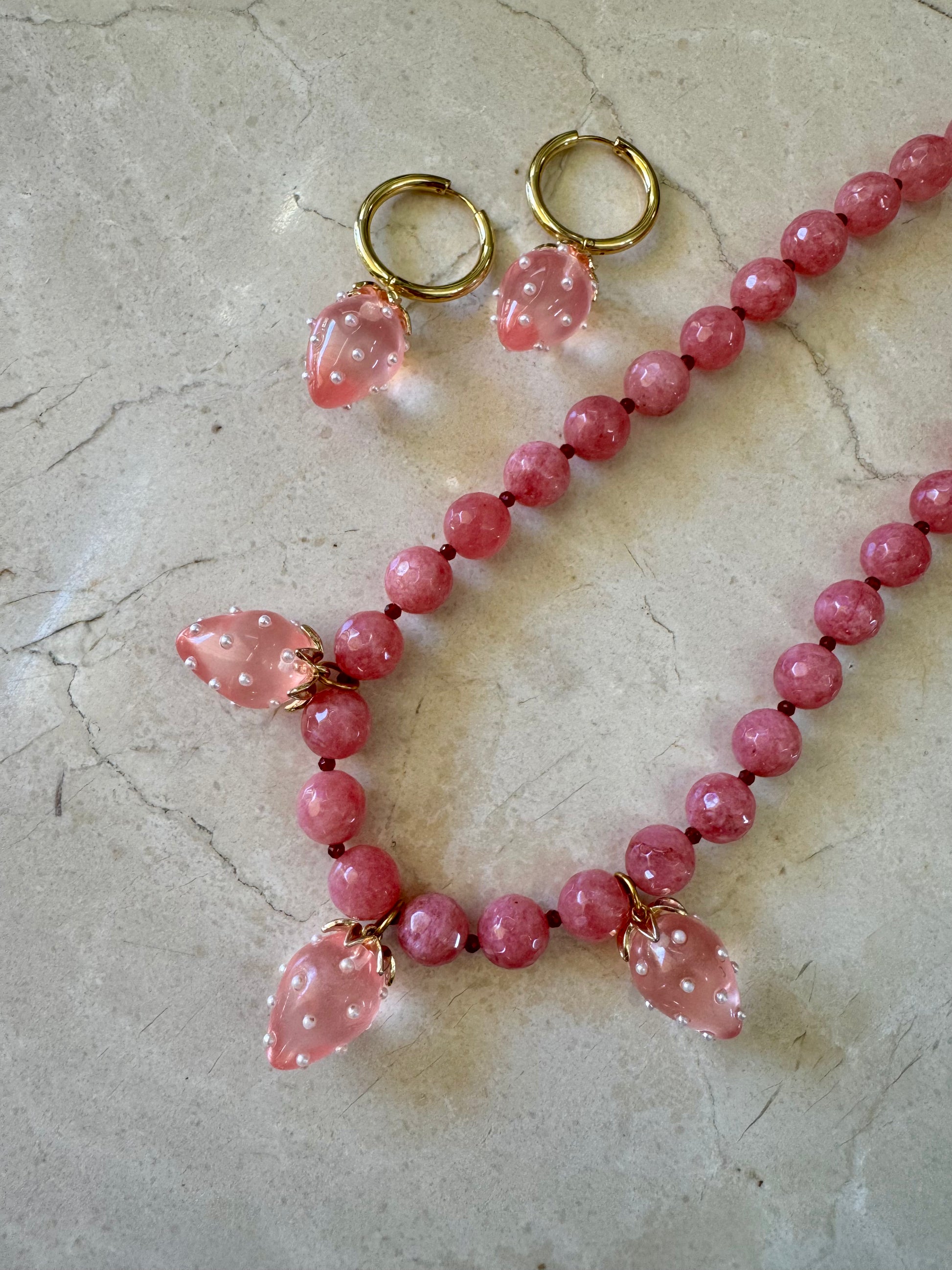 Take a look at our PINK FRUITY hoop earrings! Beautiful pink strawberries pending from 24K gold plated stainless steel hoops, these earrings are here to give a fresh yet elegant look to your outfit at any season of the year. They‘re beautiful and yummy and can also be a refined gift idea.