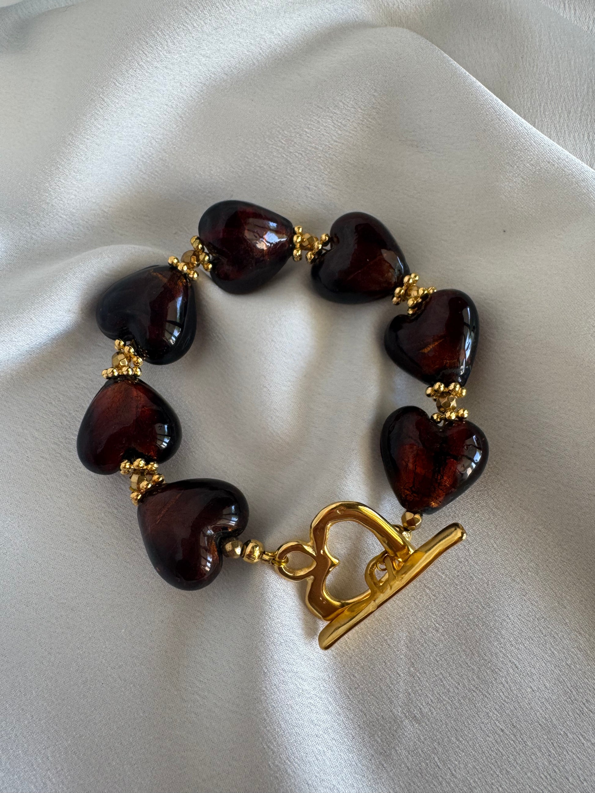 Introducing our QUEEN OF HEARTS statement bracelet, a stunning piece that speaks volumes of love and elegance! Crafted with big Murano glass heart beads and adorned with hematite beads and gold plated stainless steel elements, this bracelet exudes sophistication and style. It closes with a 24K stainless steel heart toggle clasp for secure wear.